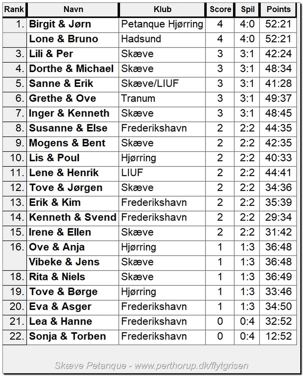 Der var klubmesterskab i Skæve Petanque den 27. september. Der var 18 tilmeldt og der blev spillet 4 kampe med skiftende makker inden vinderne blev fundet.